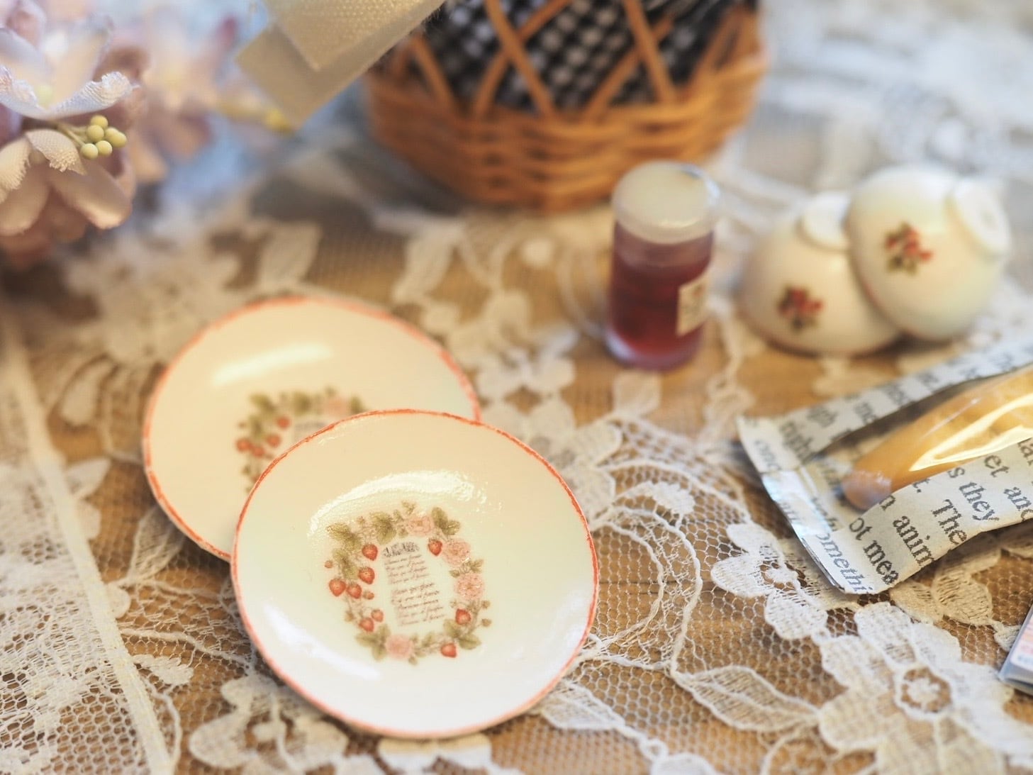 • 食器やパン、ジャムなどは 軽量石粉粘土やデカールなどを使用したハンドメイド品です。